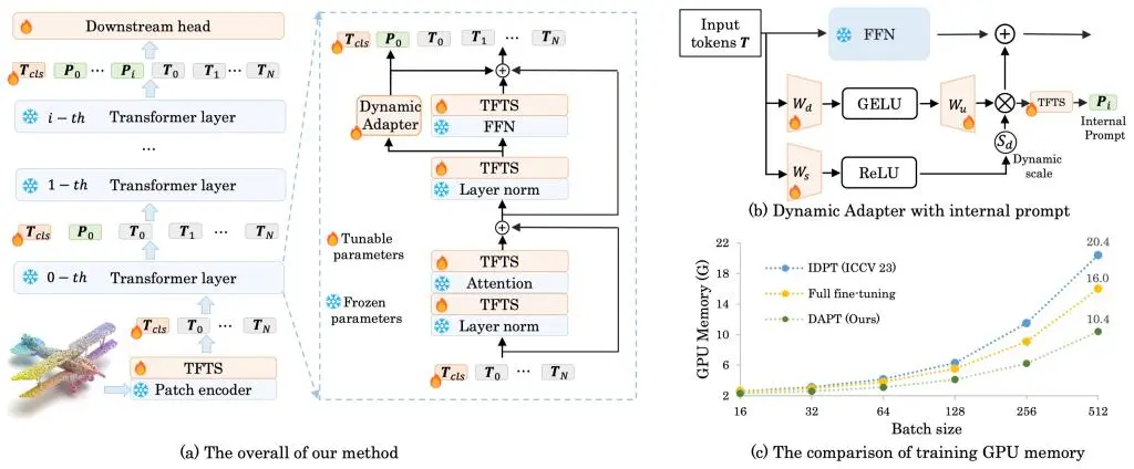 该论文专注于面向点云分析的参数高效迁移学习任务,提出了一种轻量动态适配器结构,并构建了基于模型内部特征的提示微调策略。通过在训练过程中冻结预训练模型的参数,仅对提出的模块进行优化,显著减少了95%的可训练参数,节省了50%的训练显存,同时能保证模型性能几乎不受到影响,有效降低了端侧模型的部署成本。