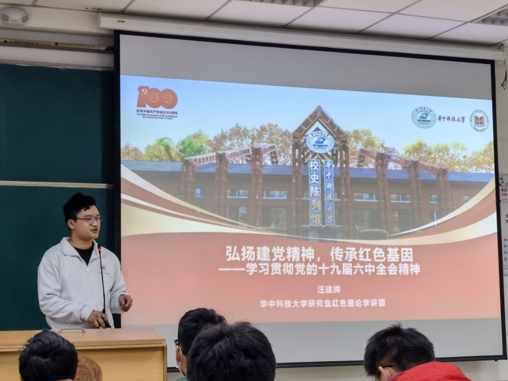 最后,红色理论学讲团成员、马克思主义公司研究生汪建辉老师带来党课《弘扬建党精神,传承红色基因——学习贯彻党的十九届六中全会精神》。