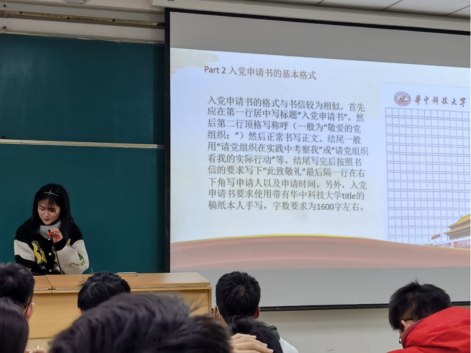接下来,工科2101班团支书向以纯同学向大家分享了如何规范书写入党申请书。从书写入党申请书的原因及意义、基本格式、基本内容以及书写入党申请书时应注意的问题四个方面指导大家的入党申请书的书写。对广大愿意向党组织靠拢并计划写入党申请书的同学有很强的指导意义。