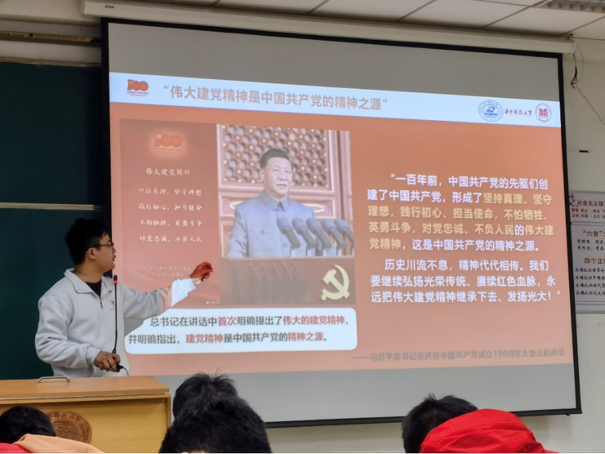 汪建辉老师带领大家回顾了党的百年奋斗,学习习近平总书记的讲话,并通过大量的理论和实例让同学们领悟了“坚持真理、坚守理想,践行初心、担当使命,不怕牺牲、英勇斗争,对党忠诚、不负人民”的建党精神。